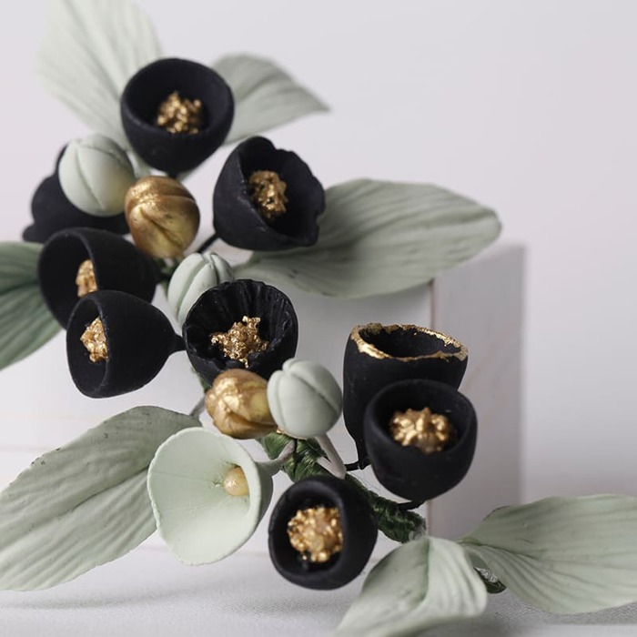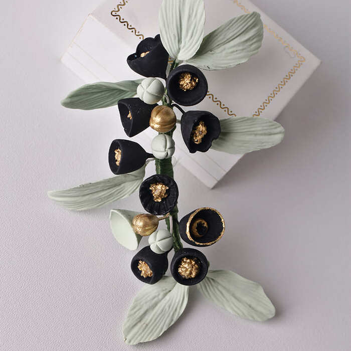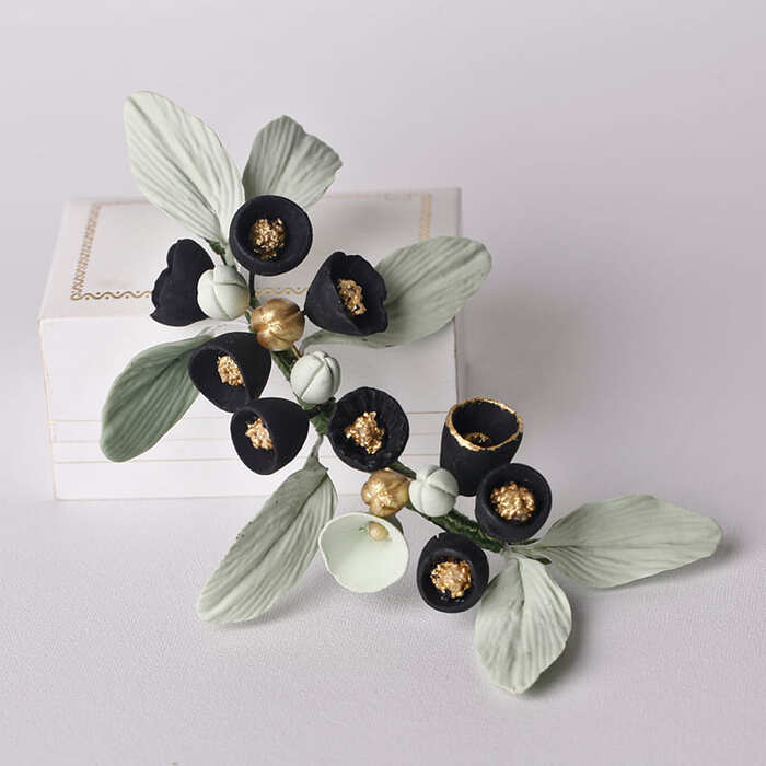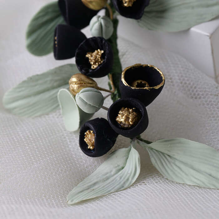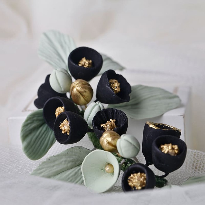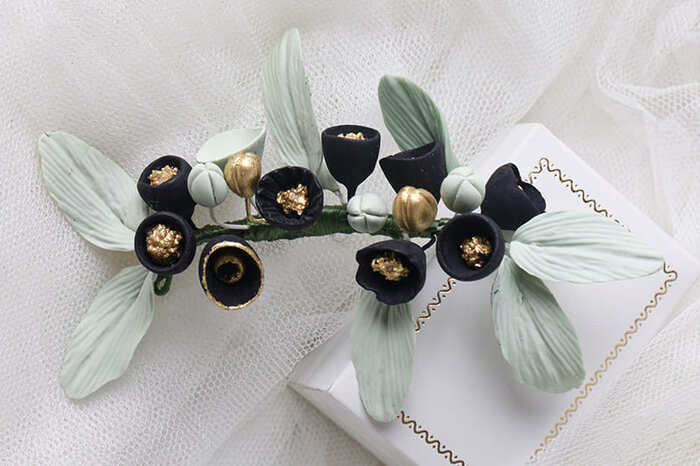 Tocado de flores artesanales de porcelana fría con combinado de verde agua, negro y toques dorados.